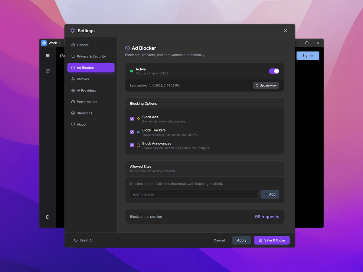 Powered by Ghostery's industry-leading ad blocker. Automatically blocks ads, trackers, and annoyances without any configuration.