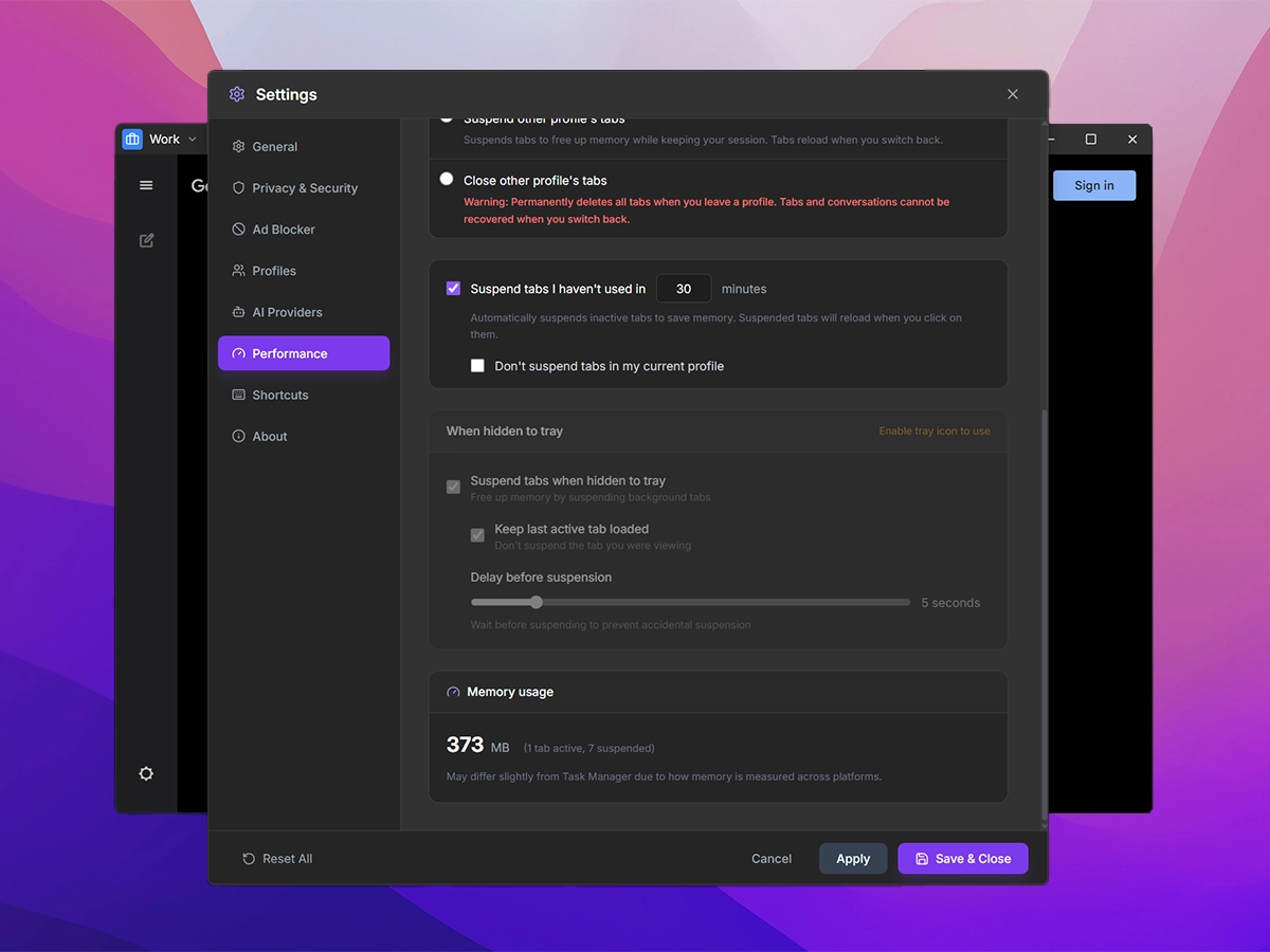 Keep dozens of tabs open without slowing down your system. Inactive tabs are automatically suspended to free up memory.